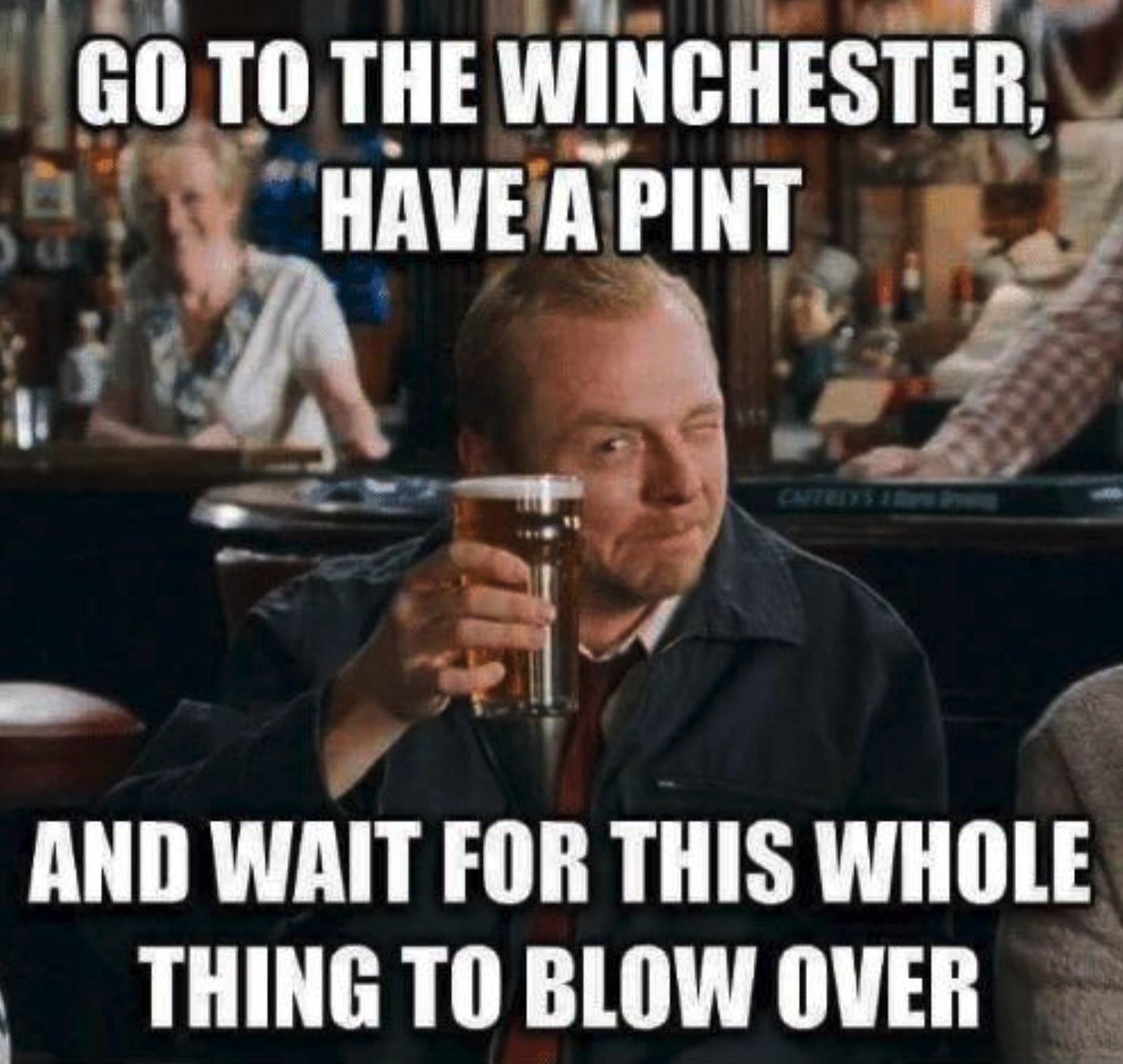 Imgflip Pro Basic removes all ads. So Nick Frost and I kind of recreated that scene from Shaun of. In fact the meme became so popular during the pandemic that Simon Pegg and Nick Frost thought it best to release a PSA advising against the memes advice and imploring people to stay home and wait for it all to blow over rather than heading to. The meme-worthy moment from Edgar Wrights 2004 movie has been repurposed in a new Shaun of the Dead coronavirus message from the films stars. And wait for this to all blow over. I am using this under fair use. Featured Shaun of the Dead Memes See All.